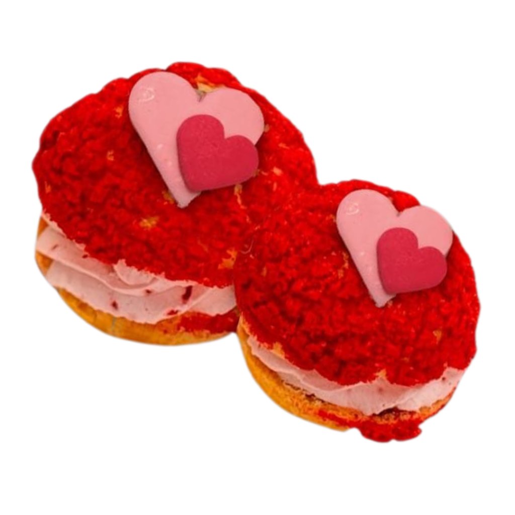 Křehké pálené těsto s malinovou šlehačkou a malinovým krémem zdobené srdcem. Platí do vyprodání zásob!