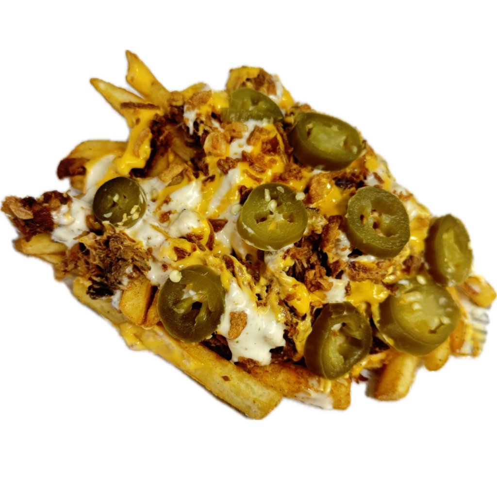Vepřové trhané maso připravované metodou sous vide s bbq, smažené hranolky,česneková mayo, plátky jalapeno, polité cheddarovou omáčkou a posypané smaženou cibulkou