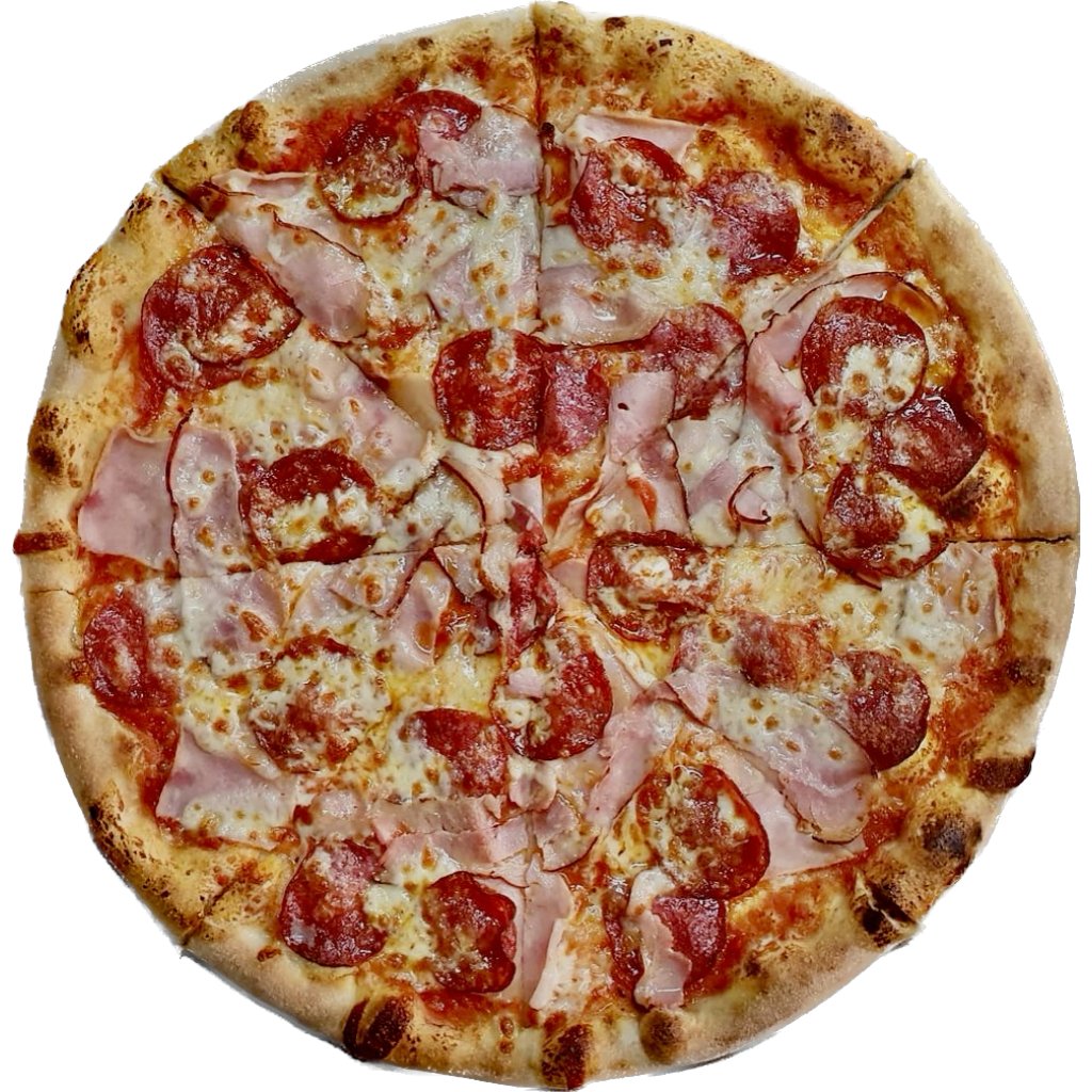Rajčatová polpa, mozzarella, šunka, slanina, paprikový salám
